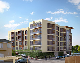 The proposed project is located on a roughly trapezoidal parcel of land, approximately 0.331 acre in size. The project site slopes gently towards Lake Merritt. The building is six stories high, with a courtyard at the podium level, along Grand and Euclid Avenues and steps down a story along Burk Street while the sidewalk slopes up, resulting in just four stories at the northeast corner and creating a smoother height transition towards some of the lower buildings nearby.