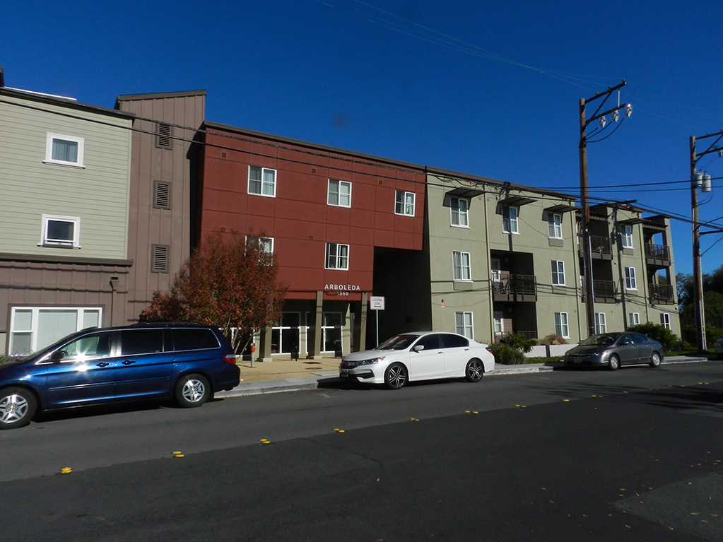 Arboleda is a three-story, wood framed, multifamily affordable housing building over a subterranean parking garage. The homes are a mix of apartments, two story townhomes and flats. The design include two individual wood framed buildings and courtyard sit atop concrete slab.