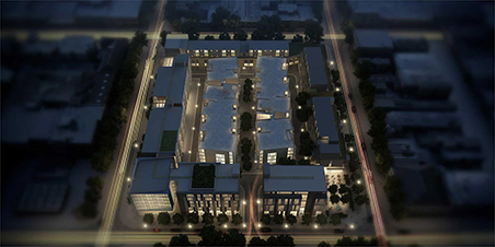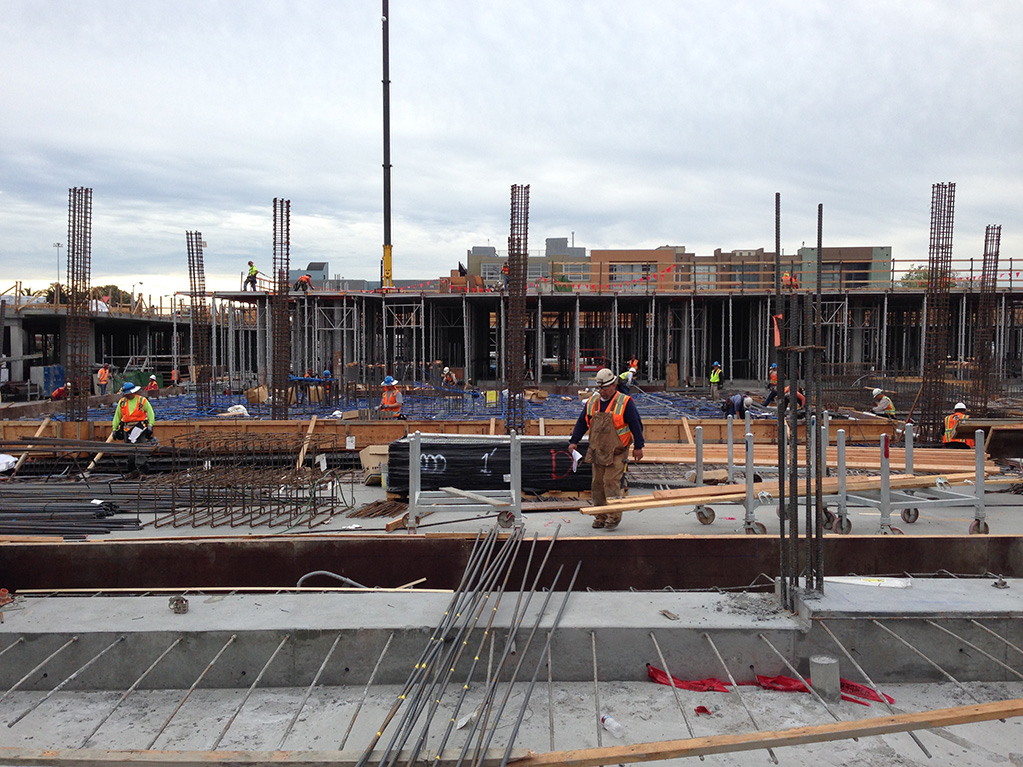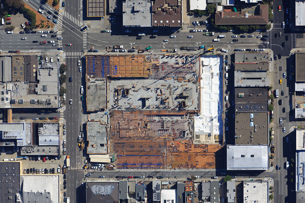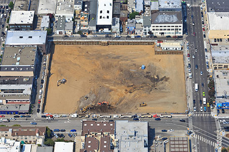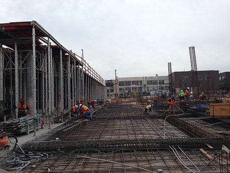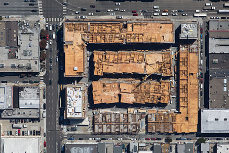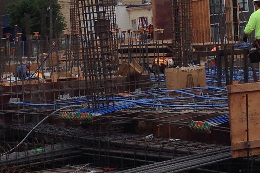The design includes four and five stories of wood framed buildings over one level individual podium post-tensioned concrete slabs above the grade level. The ground floor slab, combination of post-tensioned and reinforced concrete slabs, encompasses the entire city block.